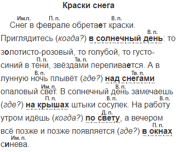 Озаглавьте текст и спишите его. На месте скобок запишите к выделенным словам смысловые вопросы г д е ? к о г д а ? Подчеркните выделенные слова как члены предложения. Обозначьте падеж всех имён существительных. Найдите существительные с предлогами, указывающими на время. Какова их роль в построении текста?